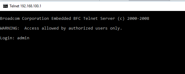Los routers usualmente tienen una dirección por defecto, 192.168.100.1, que responde independientemente de que el router esté en modo puente o no, algunas veces responde con administración, otras como en mi caso, solo abria la pantalla de status, pero con esto se me ocurrió una cosa, ¿y si el router respondiera por telnet?